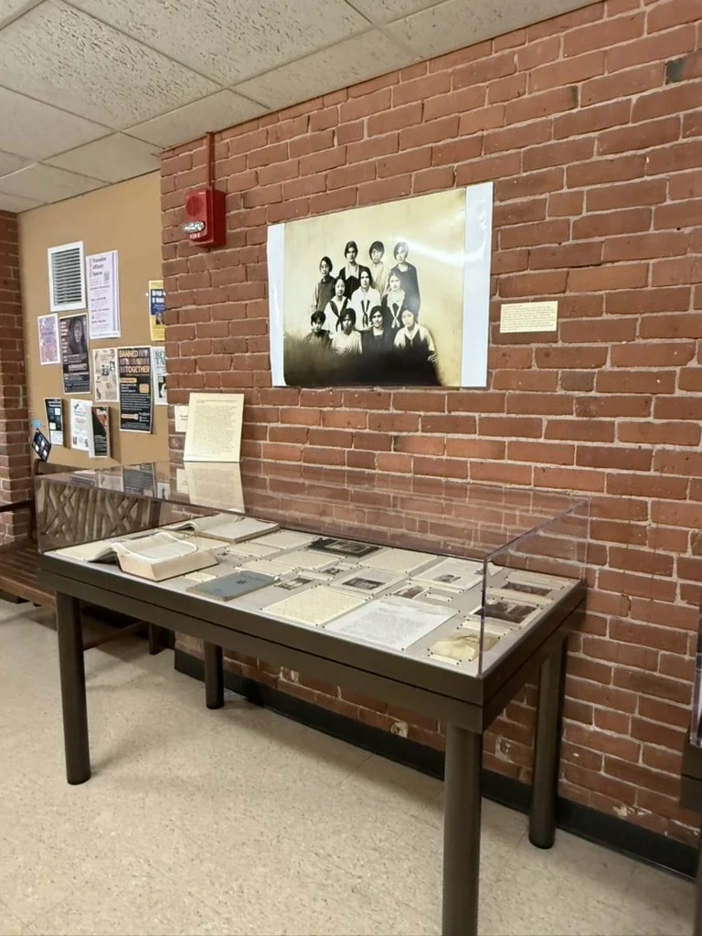 A photo of one of the cases displaying the new archives exhibit on international students at MHC.